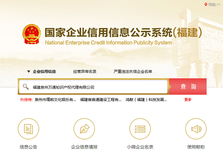 2、万通知识产权是福建省工商登记注册,请按照以下方式到福建省工商行政管理局网站http://fj.gsxt.gov.cn/index.html查询真伪,进入市场主体信用信息查询—市场主体名称输入“福建泉州万通知识产权代理有限公司",既可以查询到我司的名称、注册资金、地址等等。请务必查询我们的代理资格